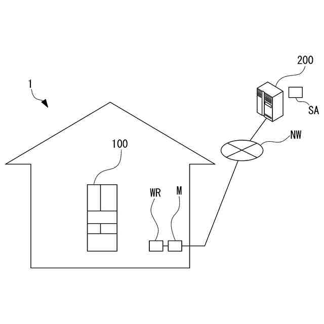 冷蔵庫100は、主として家庭で使用される電気機器(家電機器)である。冷蔵庫100は、ユーザUの住居内に配置される。冷蔵庫100は、例えば、当該冷蔵庫100と同じ住居内に設置された無線ルータWRおよびモデムMを介してネットワークNWと接続される。冷蔵庫100は、ネットワークNWを介して、サーバ200と通信可能である。なお、以下に説明する内容は、冷蔵庫100に限らず、他の家電機器(衣類処理機、空気調整装置、加熱調理器、炊飯器、コーヒーメーカ、水処理装置、ごみ処理機、電気掃除機、またはアイロンなど)にも適用可能である。