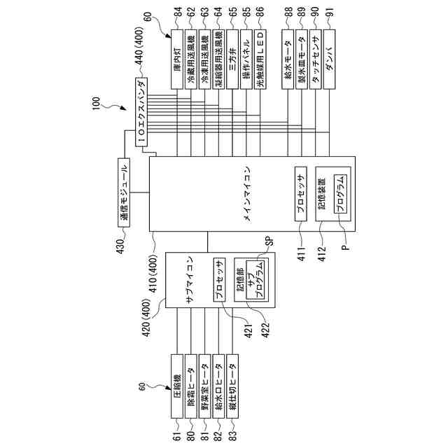 以下、実施形態の冷蔵庫を、図面を参照して説明する。以下の説明では、同一または類似の機能を有する構成に同一の符号を付す。そして、それら構成の重複する説明は省略する場合がある。本出願で「XXに基づく」とは、「少なくともXXに基づく」ことを意味し、XXに加えて別の要素に基づく場合も含み得る。また「XXに基づく」とは、XXに直接に基づく場合に限定されず、XXに対して演算または加工などが行われたものに基づく場合も含み得る。本出願で「XXまたはYY」とは、XXとYYのうちいずれか一方の場合に限定されず、XXとYYの両方の場合も含み得る。これは選択的要素が3つ以上の場合も同様である。XXおよびYYは、任意の要素(例えば任意の情報)である。本出願では、後述する情報更新時以外の制御時(メインマイコン410により制御が実施されている状態)を「通常制御時」と称する場合がある。