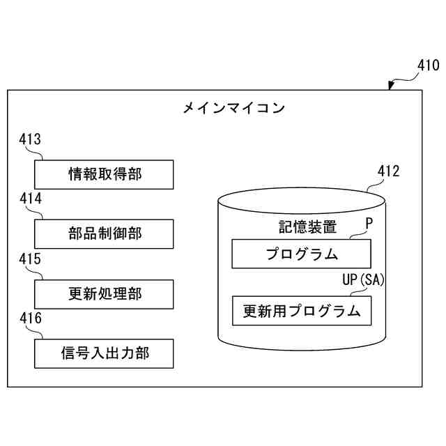 前記第2制御装置は、前記記憶装置に格納された前記情報が外部から取得された更新用情報により更新される場合に、前記電気部品の制御を維持するとともに、前記情報の更新時に対応して設定される所定の上限時間を超えて前記第1制御装置からの信号を受信しない場合に前記電気部品の動作を停止させる、