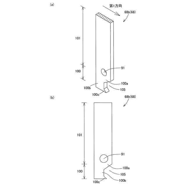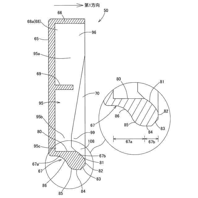 前記プレート部は、回動可能な状態で配されており、前記操作部材の操作前の状態を第1状態としたとき、前記第1状態において上下方向に延びる部分を有し、