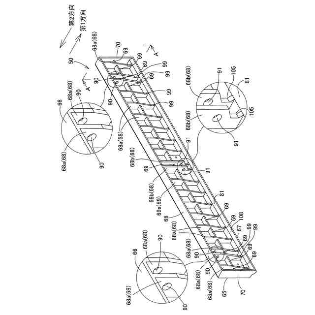 前記補強部は、前記プレート部よりも前記持ち手部の突出方向における先端側に配されて前記プレート部と連続しており、且つ、上下方向成分を含む方向に延びて下端部分が前記持ち手部の上部と連続しており、