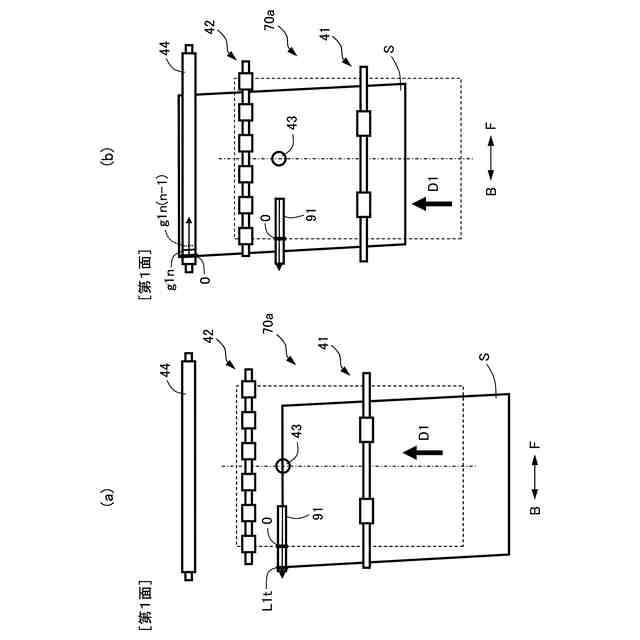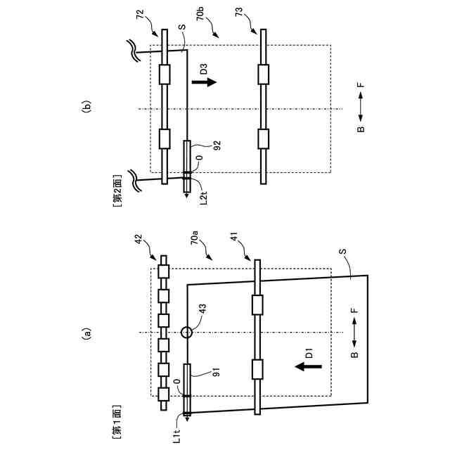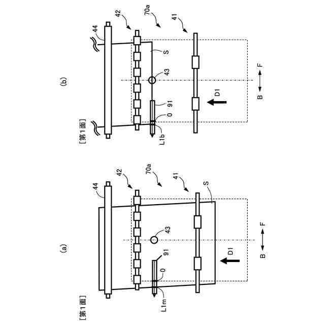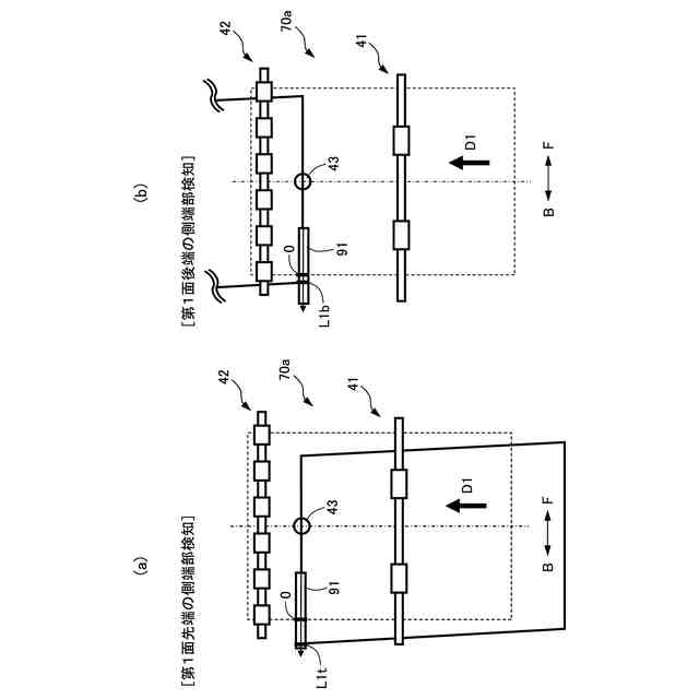 第2の実施形態に係る第1搬送部を示す図であり、(a)はシート先端を検知したとき、(b)はシート後端を検知したときである。