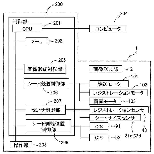 【解決手段】シートSに画像を形成する画像形成部と、画像形成部にシートSを搬送する第1搬送部70aと、シート搬送方向に交差するシート幅方向におけるシートSの位置を検知するCIS91と、CIS91の検知結果に基づき取得される、第1搬送部70aにより搬送されるシートSをシート搬送方向に三等分した領域のうちの中央の領域に位置する第1検知位置におけるシート幅方向におけるシートの第1幅位置(L1m)に基づいて、シートSに画像を形成する位置を調整する制御部と、を備える。