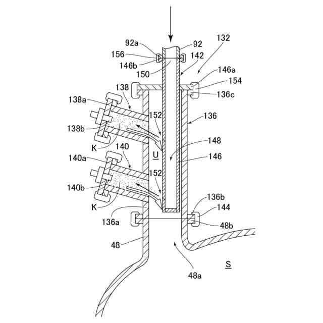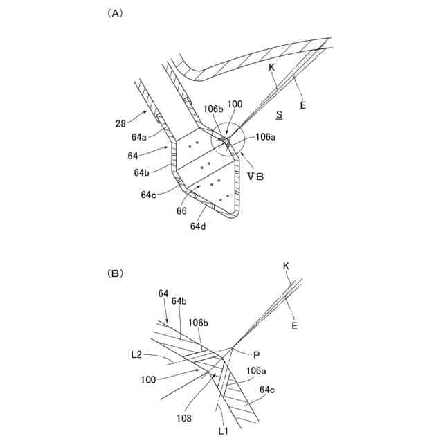 本発明に係る洗浄装置の他の特徴は、一対の前記噴射孔のそれぞれの中心線を含む仮想平面を第1基準面とし、一対の前記噴射孔のそれぞれの中心線と前記噴射孔が形成されていないと仮定したときの前記壁部の仮想外面とが交わる点を基準点とし、2つの前記基準点を含んで前記壁部の厚さ方向に広がる仮想平面を第2基準面としたとき、前記第1基準面と前記第2基準面とが交わることにある。