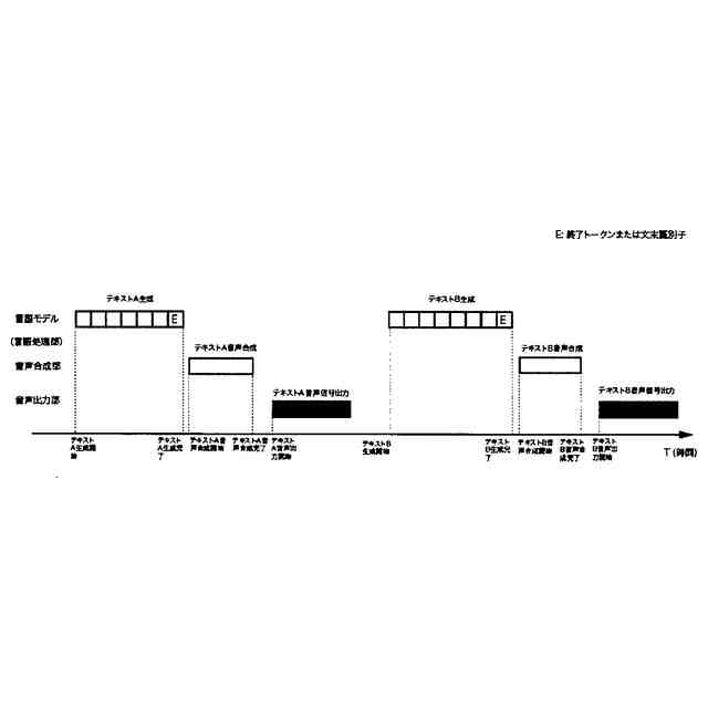 本発明では、機械学習モデルを主に用いる音声対話システムの遅延を構成する主要な要因である、音声入力、発話終端検出(EOU)、音声認識、言語モデルによる応答内容生成、テキスト処理、音声合成、音声出力、およびデータ転送や圧縮エンコードおよびデコードなどにかかるオーバーヘッド、のうち、応答内容生成から音声合成までのスループットを向上し、応答速度を高速化する。言語モデルのクロックサイクルを1000トークン/秒の生成速度、1文を構成する単語数の平均を35語、1文を構成する平均文節数を2、1トークンあたりの平均対応語数を1語、生成テキストからのマーカー検出時間をε<0.000001秒とすると、応答文の生成開始から最初の音声信号が合成開始されるまでの持続時間は平均0.35秒から0.175秒に短縮される。音声入力発話終了から応答音声信号再生開始までの平均持続時間を0.9秒とした場合、短縮された時間が全体の遅延パイプラインに占める割合は約19.4%であることから、平均して約20%の応答速度向上が実現されることになる。