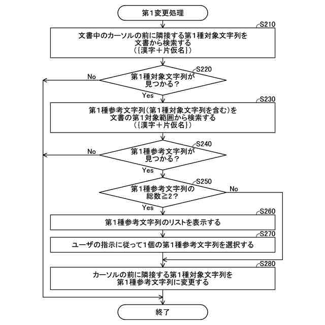 カーソルの前に隣接する第1種対象文字列を文書から検索する。第1種対象文字列は、1以上の第1種文字によって形成される。第1種文字は、所定の漢字グループの文字と所定の片仮名グループの文字とを含む。第1種対象文字列が見つかる場合に、文書の第1対象範囲から、1以上の第1種文字によって形成される第1種参考文字列を検索する。第1種参考文字列は第1種対象文字列を含む。第1種参考文字列が見つかる場合に、カーソルの前に隣接する第1種対象文字列を第1種参考文字列に変更する。