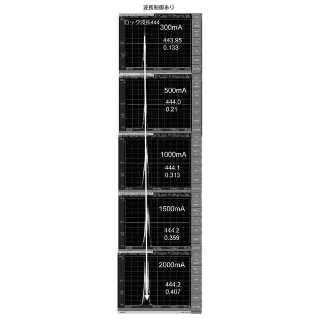 ところが、Pr:YLF結晶の吸収波長帯である400nm帯の光を発振可能な励起用GaN系LDは、市販品では5~10nmの発振波長バラツキがあり、上記吸収波長帯に合う発振波長のLDを選ぶと、歩留まりが数%となってしまう。元々LDの単価が10万円前後であることを考慮すると、LDの価格だけで100万円を超えることになる。そのため、実質工業的な量産生産を行うのは極めて困難である。また、その発振波長幅もPr:YLF結晶の吸収波長幅より広く約2nmあるため、波長が一致していたとしても、吸収効率が低下するという問題もある。また、LDは光出力や温度によりその発振波長が変動するという特性が有るので、その特性も含めてLDの発振波長をPr:YLF結晶の吸収波長に一致させて量産を行うことは極めて困難である。