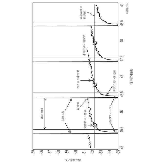 上記の方法は、図1のグラフに示されている。この図は、より長い期間にわたって測定された露点温度の推移を示す。この図では、静電容量型湿度センサが、30分ごとに加熱又は冷却される。さらに、この図では、正確な露点温度又は露点温度の目標値が、連続する水平線として示されている。加熱工程後に、図から分かるように、それぞれ1つの冷却フェーズが発生する。この冷却フェーズでは、当該湿度センサは、再び周囲温度に戻り、この冷却フェーズでも、正確な露点温度が測定不可能である。次いで、この冷却フェーズ後に、正確な露点温度が再び測定され得るまで、一定の時間が持続する。その後に、再び加熱されるまで、湿度を感知するポリマーの変化に起因して、露点温度が高い値に向かって移動し、新たな冷却フェーズ後に、正確な露点温度が、所定の測定期間に再び測定可能である。これが、繰り返される。