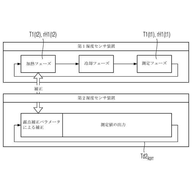 【解決手段】第1湿度センサ装置が、少なくとも1つの露点補正パラメータを決定するように構成されていて、第1湿度センサ、第1温度センサ及び温度変化要素を含む。第2湿度センサ装置は、露点温度を連続して測定するように構成されていて、第2湿度センサ及び第2温度センサを含む。制御装置を使用することで、第1湿度センサ装置の温度が、温度変化要素によって変更され、露点補正パラメータが決定される。さらに、当該第1湿度センサ装置からの露点補正パラメータは、第2湿度センサ装置の測定値を補正し、当該補正された測定値に基づいて、補正された露点温度を連続して出力するために使用される