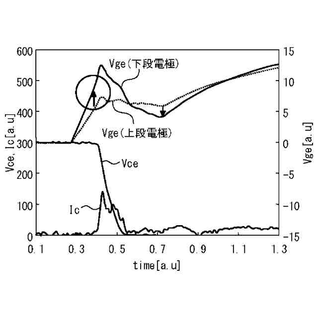 絶縁ゲート型バイポーラトランジスタ(IGBT: Insulated Gate Bipolar Transistor)のスイッチング損失低減にはスイッチング速度の高速化が有効である。高速化の課題として電磁ノイズの発生がある。ノイズは低電流時のIcピークと相関があることが報告されている(例えば、非特許文献1参照)。Icピークはターンオン時のゲート電圧Vgeのオーバーシュートに依存し、Vgeは変位電流(Idis=Cgc×dV/dt)が大きいほど、Cgeが小さいほど増加する。ここで、Cgcはゲート-コレクタ間容量、Cgeはゲート-エミッタ間容量である。従って、電磁ノイズを抑制するにはCgc/Cge比を小さくする必要がある。