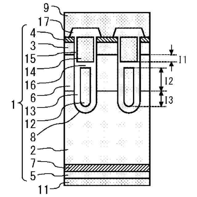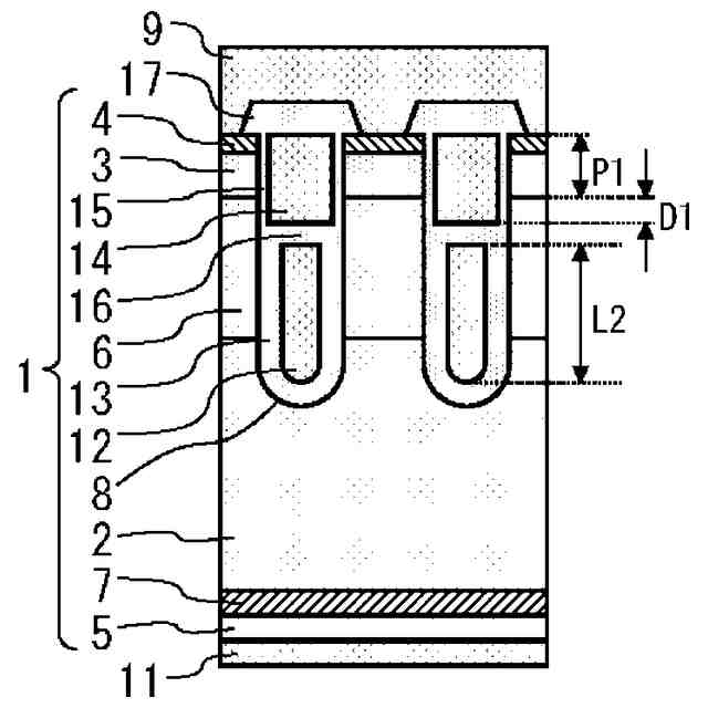 図1は、実施の形態1に係る半導体装置を示す断面図である。半導体基板1は、少なくとも、第1導電型のドリフト層2と、ドリフト層2の上に形成された第2導電型のベース層3と、ベース層3の上の一部に形成された第1導電型のソース層4と、ドリフト層2の下に形成された第2導電型のコレクタ層5とを有する。第1導電型のキャリア蓄積層6がドリフト層2とベース層3の間に形成されている。第1導電型のバッファ層7がドリフト層2とコレクタ層5の間に形成されている。キャリア蓄積層6及びバッファ層7はドリフト層2よりも不純物濃度が高い。例えば、第1導電型はn型、第2導電型はp型であるが、その逆でもよい。半導体基板1の上面からソース層4及びベース層3を貫通する複数のトレンチ8が並んで形成されている。