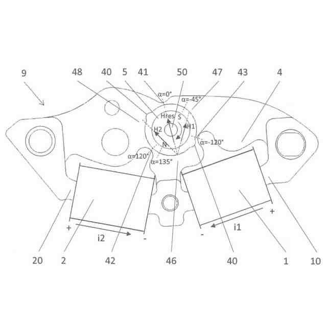 前記第1のコイル(1)が前記3つの磁極片(46、47、48)のうち第1の磁極片(46)と第2の磁極片(47)との間に配置され、前記第2のコイル(2)が前記3つの磁極片(46、47、48)のうち前記第1の磁極片(46)と第3の磁極片(47)との間に配置される、請求項6に記載のアセンブリ。