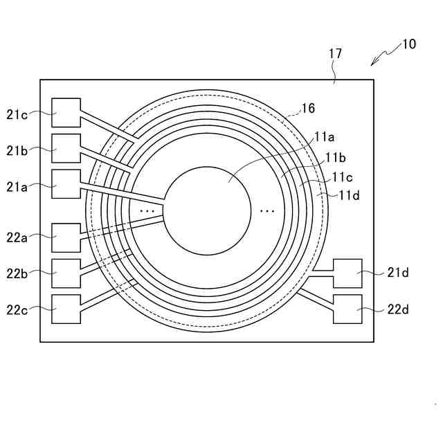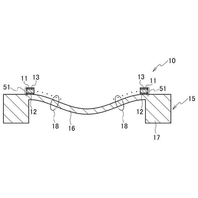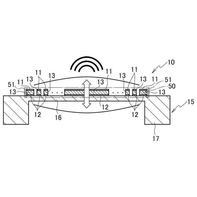 圧電素子は一対の電極に対して駆動電圧を繰り返し印加することで、圧電素子と共に振動膜が上側への変位と下側への変位を交互に繰り返す。具体的には、振動膜の先端側が反るように変位する。当該振動膜の振動により、振動膜の周囲の空気が振動させられ、空気の振動が音波として出力される。出力される音波の性質は、振動体(例えば、振動膜)の強度などの性質や大きさ(径や長さ)などによって決まる振動体の共振周波数に依存している。