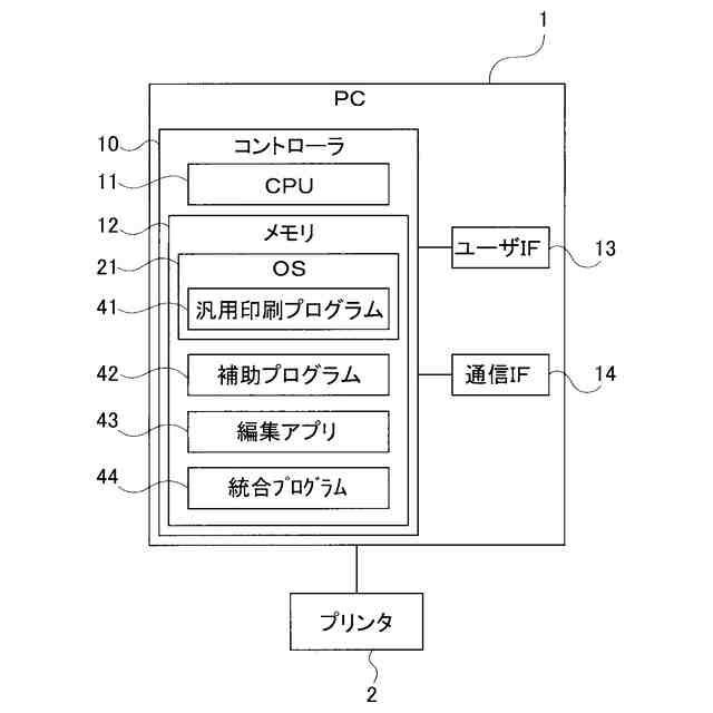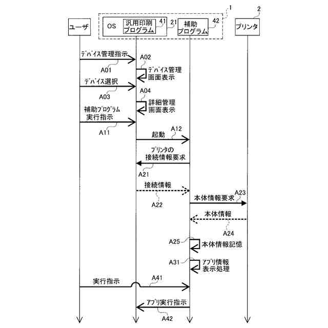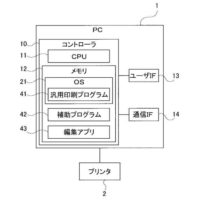 【解決手段】補助プログラム42は、編集アプリ43等から出力された印刷指示があったことによって、汎用印刷プログラム41から処理が要求される。また、補助プログラム42は、プリンタ2が選択された状態で、起動指示をOS21が受け付けたことによって、汎用印刷プログラム41から処理が要求される。補助プログラム42は、起動指示をOS21が受け付けたことによって処理が要求された場合に、PC1のCPU11に、汎用印刷プログラム41を介して、プリンタ2が有する能力を示す能力情報を取得させ、管理対象となる複数のアプリのうち、取得された能力情報に示される能力を利用するアプリを示す情報を一覧表示させ、表示されるアプリの実行指示を受け付けさせる。