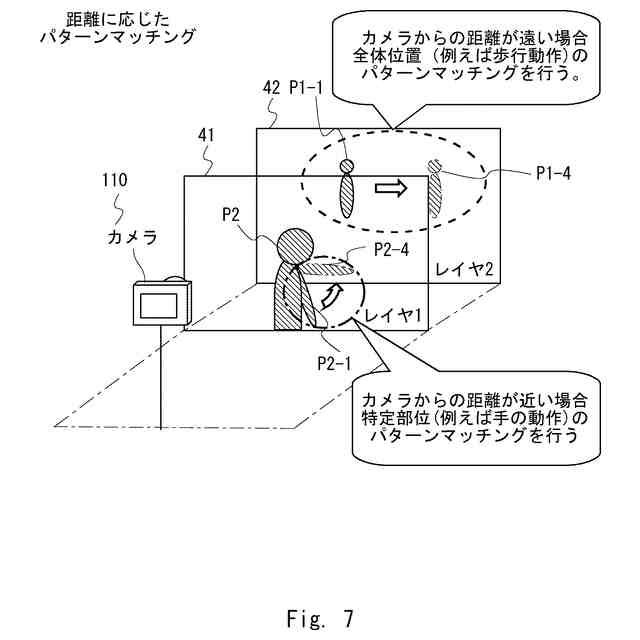 所定時点にカメラにより撮影され、かつ、前記カメラとの距離が異なる複数のレイヤに対応する複数のレイヤ画像に対して、各レイヤに応じた検出方式により前記レイヤ画像内の人物の特定の行動を検出する検出部を備え、