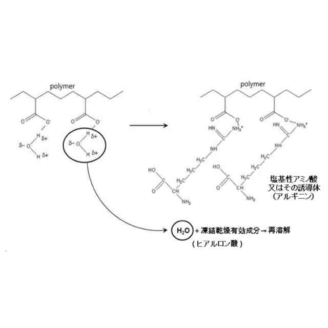 本発明の水分散性高分子と塩基性アミノ酸を共に含んで凍結乾燥された成分は、塩基性アミノ酸を共に含むことによって、凍結乾燥成分がこれをとかすための剤形と混合されるとき、前記固体成分をとかすための剤形に含まれた高分子と凍結乾燥された成分のアミノ酸が反応して水分子を分離させることによって、剤形内の凍結乾燥成分に含まれた機能性成分の再溶解がよく行われるようにすることができる。