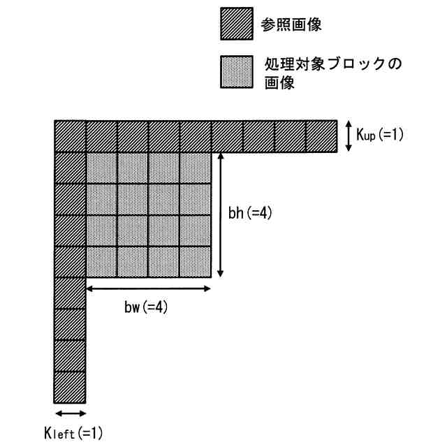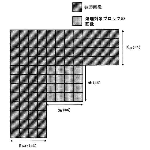 図2は、水平画素bwが4画素、垂直画素Bhが4画素からそれぞれ構成される処理対象ブロックに対して、拡大された参照範囲の具体例を示す図である。