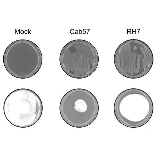 試験例3において、7日間培養した後のプレート上の黒根腐病菌の菌糸コロニーを比較観察した写真である。上のプレートは各種シュードモナス属細菌を培養したプレート又はMockであり、下のプレートは黒根腐病菌を接種したプレートである。