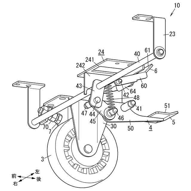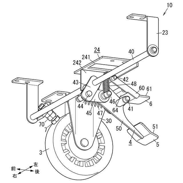 本発明は上記従来の問題点に鑑みて発明したものであって、下方に踏まれるブレーキペダルと、下方に踏まれる解除ペダルとを備え、ペダルを下から蹴り上げる操作がなくてすむ台車を提供することにある。