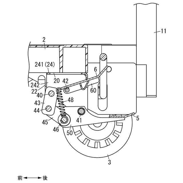 前記ブレーキ部材は、前記ブレーキ部材が押し付けられる前記キャスターの前後方向における中心部よりも前方に位置しており、