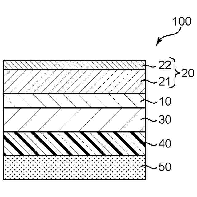 図1は、本発明の1つの実施形態による偏光板の概略の構成を示す模式的な断面図である。偏光板(代表的には、円偏光板)100は、偏光子10と、偏光子10の片側に配置された積層フィルム20と、偏光子10のもう片側に配置された保護層30と位相差層(代表的には、λ/4板)40と粘着剤層50とを有する。積層フィルム20は、基材21と基材21上に形成された表面処理層22とを含み、基材21は、偏光子10の保護層として機能し得る。保護層30は省略されてもよく、この場合、位相差層40は偏光子の保護層として機能し得る。