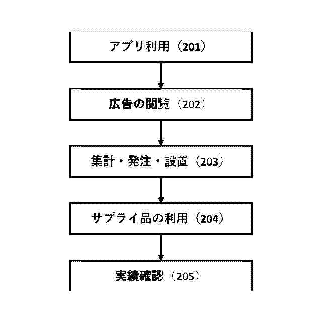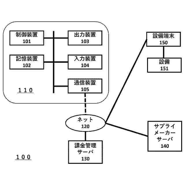 以下に、 本発明の一実施形態を図1を参照しながら説明する。パーソナルコンピューター、スマートフォン、タブレット等の利用者の情報処理端末110は、システムの利用者側の動作を制御する制御装置101、記憶装置102、液晶モニタやスピーカーなどの出力装置103、タッチパネルやキーボードあるいは音声入力用のマイクなどの入力装置104、外部ネットワークとの通信用の通信装置105等を備える。情報処理端末110はネット120を介して課金管理サーバ130と接続されている。好適には、課金管理サーバ130はユーザに健康管理、ゲーム、教育、ECサイトなどの購買サイトなどのアプリケーションソフトウェアプログラムや、広告情報をユーザの情報処理端末110に提供する企業等が運営するものであり、1社のサーバからなっても複数社のサーバからなっても良い。サプライメーカーサーバ140は課金管理サーバ130、情報処理端末110とネット120を介して接続されたサーバであり、サプライ品を製造および/または販売する企業の運営するものである。この企業は直接または間接的にサプライ品を提供する企業であり、情報処理端末110または課金管理サーバ130からの指示に従って、所定のサプライ品を所定の設備に配送、設置するように機能する。設備端末150はサプライ品提供企業が配送、設置するサプライ品の設置施設に含まれるもので、サプライ品の管理設備151と接続され、また、ネット120を介して、情報処理端末110、課金管理サーバ130、サプライメーカーサーバ140と接続されて、サプライ品の状況を他施設と共有することができる。