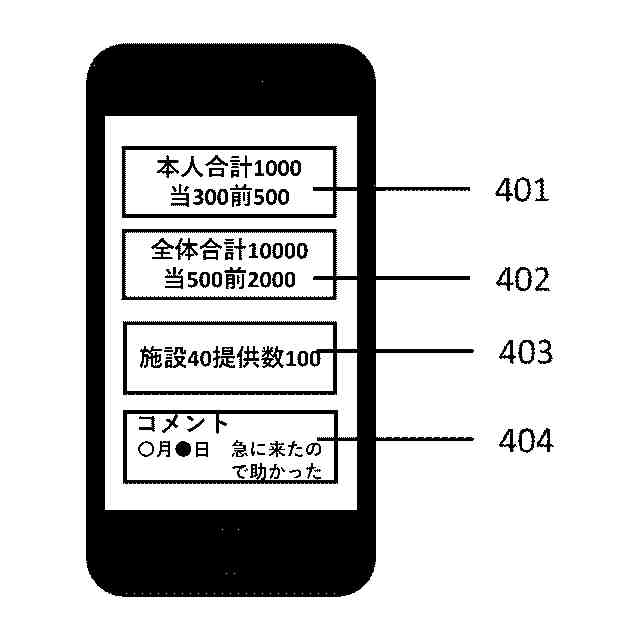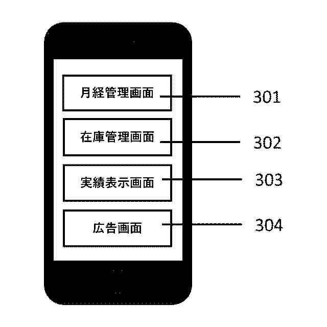次に本発明の実施例を図2のフローに基づいて以下に説明する。本発明では女性向けの月経管理アプリに基づいたシステムを例に説明するが本発明の趣旨に基づく限りこれに限られない。(201)女性ユーザが情報処理端末110にインストールされた月経管理アプリの利用を開始する。月経管理アプリのユーザの利用画面の例を図3に示したが、これは単なる画面イメージの一例であって、他のUIを用いることができることはいうまでもない。図3において、月経に関する情報、例えば、生理日予測や、当日の状況などの表示や入力を入力する機能を持つ月経管理画面301、後述するサプライ品の設置施設の検索や当該施設でのサプライ品の在庫状況などの機能を持つ在庫管理画面302、ユーザの貢献度、貢献先、全体としての成果やユーザの感謝のコメントなどを表示する機能を持つ実績表示画面303、他社の商品やサービスに関する広告を表示する広告画面304からなる。ユーザは月経管理アプリの利用手順に従って、日々の健康状態や、月経時には月経の状態、基礎体温などの入力を行い、月経管理アプリからの次回の生理日予測や周期の中での現在の状態、たとえば、月経期、キラキラ期、どんより期などに応じたダイエットや食事のアドバイスなどの情報を得る。