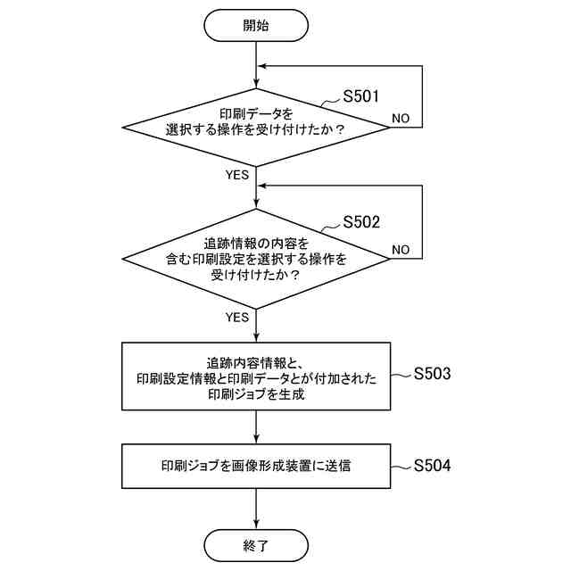 本開示の一形態に係るプログラムは、コンピュータに、印刷ジョブを保存する保存時についての追跡情報、及び前記印刷ジョブを実行する実行時についての追跡情報から前記ユーザの操作により選択された追跡情報と、印刷データとを前記印刷ジョブに付加する機能と、前記印刷ジョブを画像形成装置に送信する機能とを実行させる。