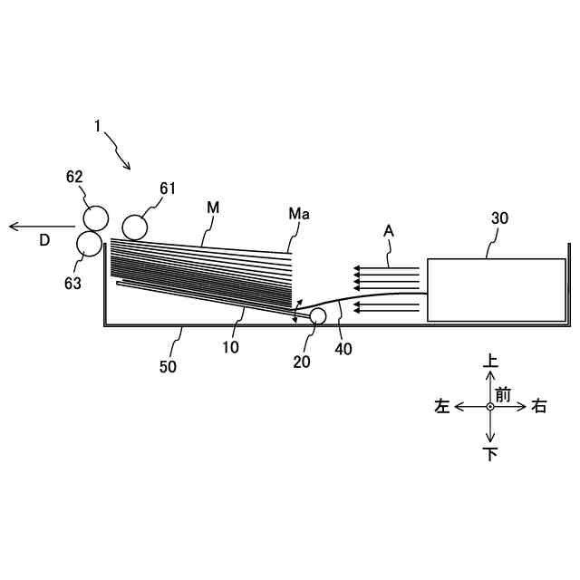 ところで、積載台上の媒体の供給方向における上流側部分にエアを吹き付け、複数の媒体を互いに分離させる構成を採用し、且つ、積載台を傾けて昇降させる構成を採用する場合、媒体の残量が減ってくると、積載台の水平に対する傾きが大きくなる。そのため、媒体の残量が少ない状態では、媒体の上流側部分にエアが吹き付けられにくくなり、複数の媒体が互いに分離しにくくなる。媒体を分離することができないと、媒体の重送が発生する。なお、媒体の残量が少ない場合にエアの気流の向きを水平から斜め下方に変更することが考えられるが、気流を変更するために構造が複雑化するとともに、気流の向きと積載台上の媒体とが平行にならないため媒体が分離しづらい。
