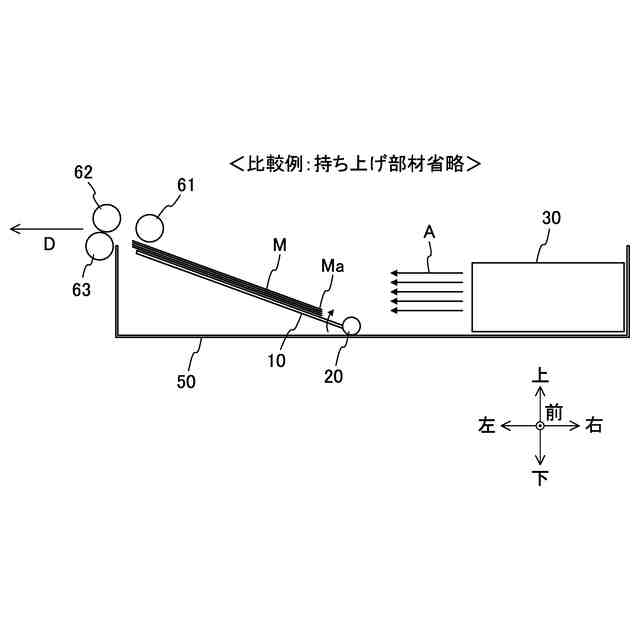 比較例における、持ち上げ部材が省略された状態の媒体供給装置の内部構造を示す正面図である。