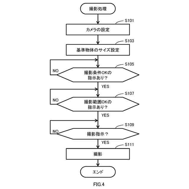 前記処理部がガイドすることは、前記基準物体を前記演算に必要な位置に設置したことを示すユーザ操作を受け付けると、前記カメラによる前記測定対象の撮影を許可する、ことを含む