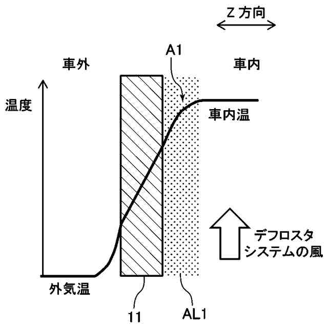 本件発明者らは、鋭意研究を更に重ねた結果、デフロスタシステムからの風などの影響によって、フロントウィンドウの車室側の表面において結露に寄与する空気層(以下では単に「結露空気層」と呼ぶ。)の厚さが一様でないこと、つまり結露空気層の厚さがフロントウィンドウの面内方向において種々に変わることを見出した。そのため、フロントウィンドウの面内方向において変わる結露空気層の厚さに応じて、フロントウィンドウの表面付近の状態量(温度や湿度)も種々に変わることとなる。上記した特許文献1に記載された技術は、このようなフロントウィンドウの面内方向において変わる結露空気層の厚さを考慮していなかったため、フロントウィンドウの表面付近の状態量の検出精度を改善する余地があった。