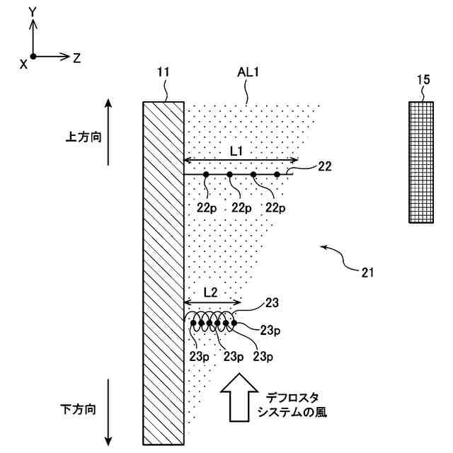 フロントウィンドウの曇りは、その表面付近における状態量(具体的には温度や湿度)に依存する。フロントウィンドウの表面付近の温度や湿度は、車室の空調装置による内気循環/外気導入の選択や、乗員数や、外気温等の周囲環境によって変化する共に、フロントウィンドウの表面に沿う方向(以下では「面内方向」と呼ぶ。)、及び、フロントウィンドウの表面に対して直交する方向(以下では「面外方向」と呼ぶ。)において、数mm~数cmのオーダーで大きく変化する。したがって、デフロスタシステムの消費エネルギーを抑えつつ、フロントウィンドウの曇りを防止するためには、フロントウィンドウの表面付近の温度や湿度を正確に把握した上で、デフロスタシステムを適切に作動させるのが望ましいと言える。