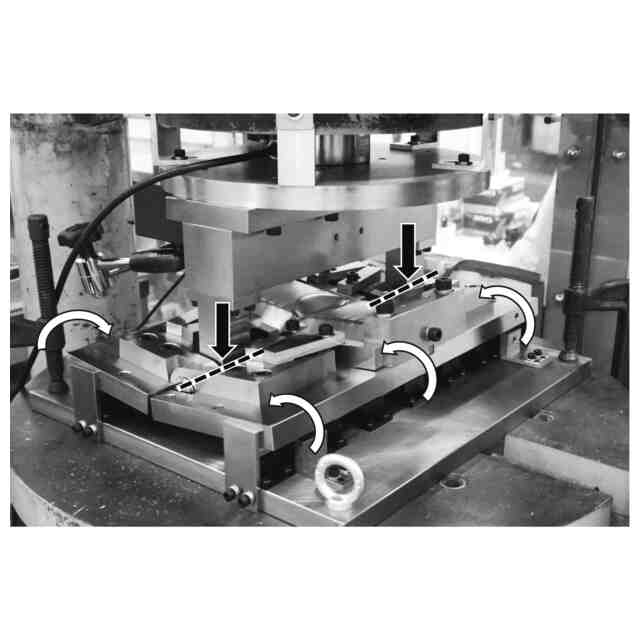 もっとも、製品の実形状に基づく試験片を用いた曲げ試験に、既存の規格をそのまま適用できないことも多い。例えば、自動車のフレーム(骨格)などに用いられる薄板の成形品に対して、規格されている3点曲げ試験や4点曲げ試験を行なうと、圧子で加圧される部分が局所的に変形(陥没)して成形品の断面形状が崩れるため、その曲げ特性を適切に評価できない。