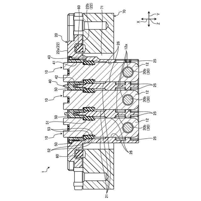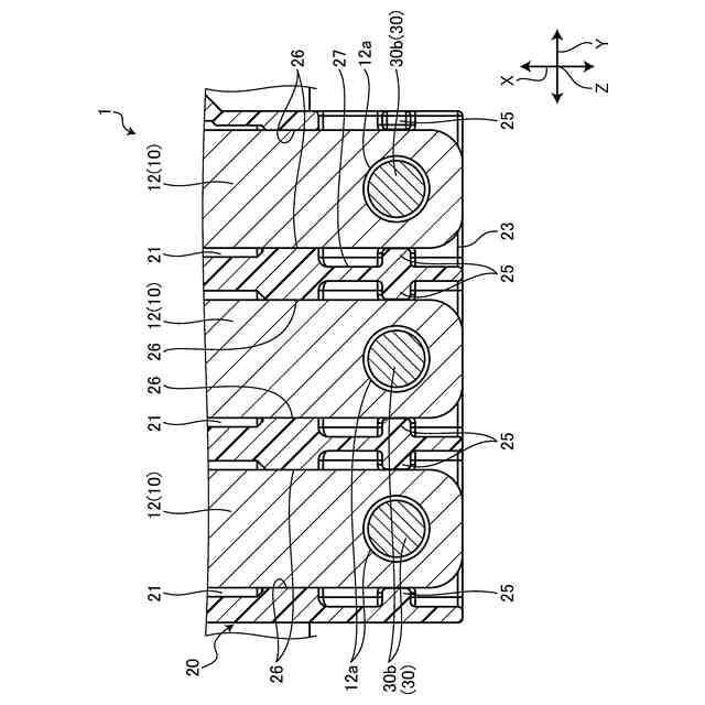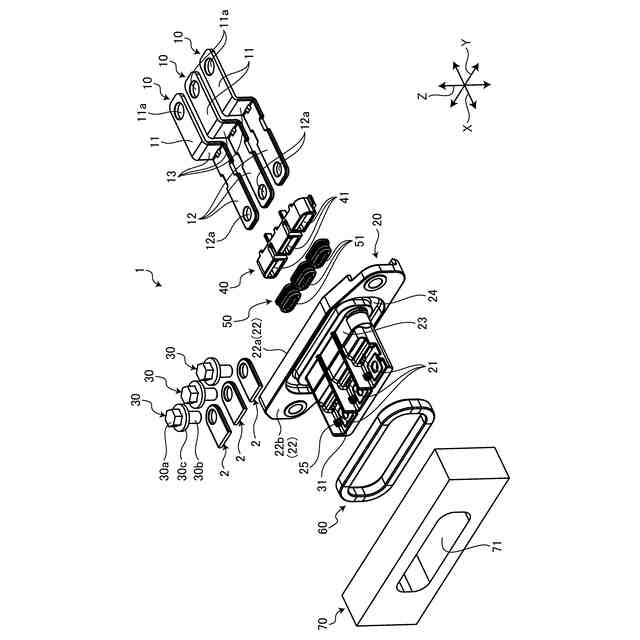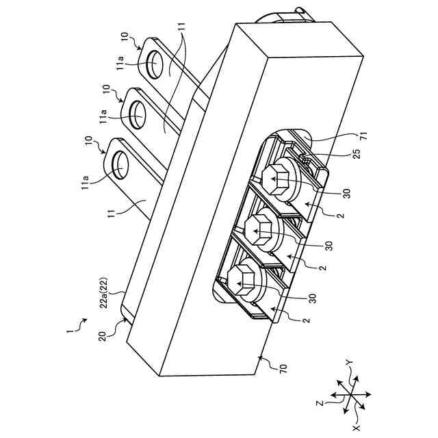 図1は、実施形態に係る端子台1の斜視図である。図1に示される本実施形態の端子台1は、例えば、電気自動車やハイブリッド自動車等の車両に搭載され、取付対象物70に取り付けられると共に、不図示の第1機器と第2機器との電気的接続を中継するものである。本実施形態の端子台1は、複数のバスバ10を含んで構成され、当該複数のバスバ10の一端部に設けられた第1接続部11に対して第1機器の外部端子が電気的に接続される。また、本実施形態の端子台1は、複数のバスバ10の他端部に設けられた第2接続部12に対して第2機器の外部端子2が電気的に接続される。第1機器は、例えば、モータおよびインバータのうちの一方であり、第2機器は、例えば、モータおよびインバータのうちの他方である。なお、端子台1は、この例には限定されず、例えば、第1機器または第2機器と配索材との中継や、配索材と配索材との中継等に用いられてもよい。