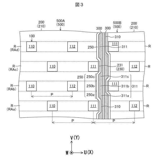 回路基板の表面において、各々の発光素子列は、X軸方向に連続して帯状に延在する仮想領域である帯状仮想領域に配置されている。各々の帯状仮想領域は、発光素子列を内包する。発光素子列がY軸方向に並んでいることに対応して、間隔をおいてY軸方向に並ぶ複数の帯状仮想領域が回路基板の表面に想定される。