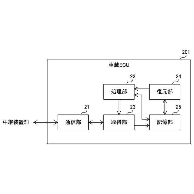 (1)本開示の実施の形態に係る車載システムは、所定の対象データを復元するための分散データであって、複数の保存先に分散して保存された複数の前記分散データの前記保存先を示す保存先情報と、前記複数の分散データを用いた前記対象データの復元方法を示す復元情報とを記憶する1または複数の記憶装置と、前記記憶装置における前記保存先情報および前記復元情報を、外部の装置へ送信する送信装置とを備える。