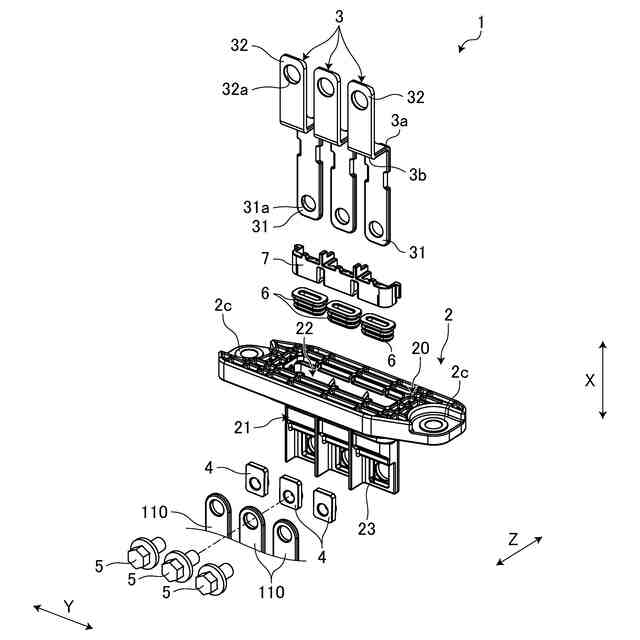 前記バスバを保持する保持部と、前記ねじ穴を前記貫通孔と対向させて前記ナットを保持する凹部と、を有するハウジングと、