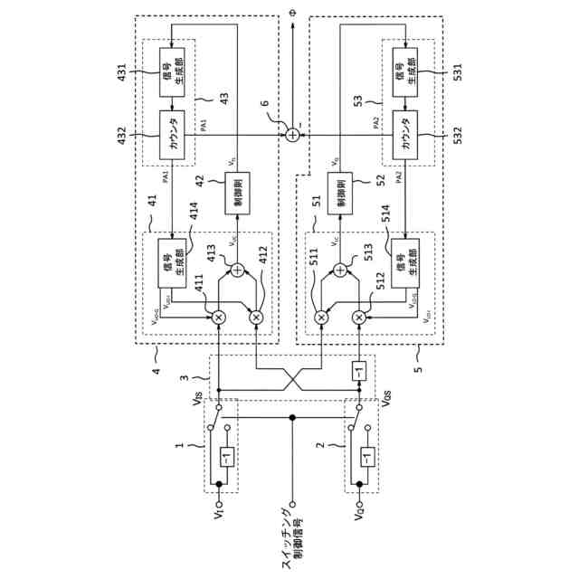 角度検出信号処理装置は、スイッチング動作部1と、スイッチング動作部2と、信号処理部3と、位相ロック部4と、位相ロック部5と、位相差演算部6と、を備えている。