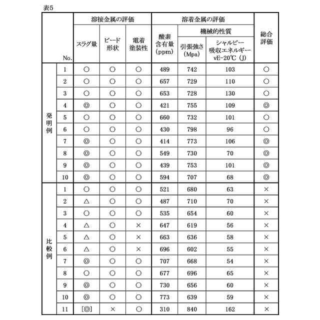一方、ソリッドワイヤと比較してメタル系フラックス入りワイヤでは、溶接金属中の酸素量が増加することによって、スラグ発生量が増えて電着塗装性を低下させたり、機械的特性の劣化が生じてしまう。そこで、本発明者らは、特に、酸素との親和性が低いとされるC、Ni、Cr及びMoの含有量を適切に制御することにより、強度と靱性とがバランスよく優れた溶接金属を得ることができることを見出した。また、本発明者らは、Si、Mn及びTiの含有量を適切に制御することにより、溶接金属中の酸素量を制御しつつ、導電性のあるスラグを主とすることで、溶接金属の電着塗装性を向上させることができることを見出した。これにより、メタル系フラックス入りワイヤを使用した場合であっても、電着塗装性及び機械的性質を向上させることができる。本発明は、これらの知見によってなされたものである。