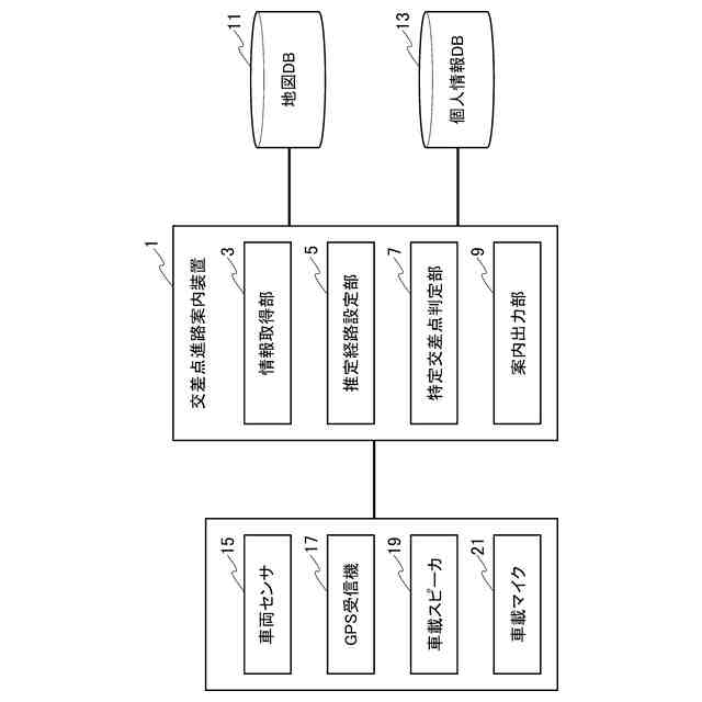 図1を参照し、本実施形態に係る交差点進路案内装置の構成を説明する。図1は、本実施形態に係る交差点進路案内装置の構成を示すブロック図である。図1に示すように、交差点進路案内装置1は、情報取得部3と、推定経路設定部5と、特定交差点判定部7と、案内出力部9と、地図データベース11と、個人情報データベース13とを備えている。また、交差点進路案内装置1は、車両センサ15と、GPS受信機17と、車載スピーカ19と、車載マイク21とに接続されている。