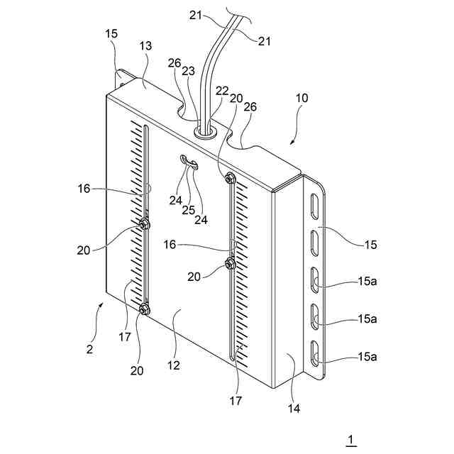 以下、添付図面を参照して、本発明の一実施形態について説明する。図1は、本発明の冠水検出ユニット1を構成するセンサユニット2の構造を概略的に示す表側から見た斜視図である。図2は、センサユニット2の構造を概略的に示す裏側から見た斜視図である。冠水検出ユニット1は、後述するように、車道と歩道との間に設置されて、車道の冠水を検出するように構成される。図1及び図2を併せて参照すると、一具体例に係るセンサユニット2は、例えば平たい直方体の外形を有するブラケット10と、ブラケット10に保持される1以上の冠水計11と、を有している。