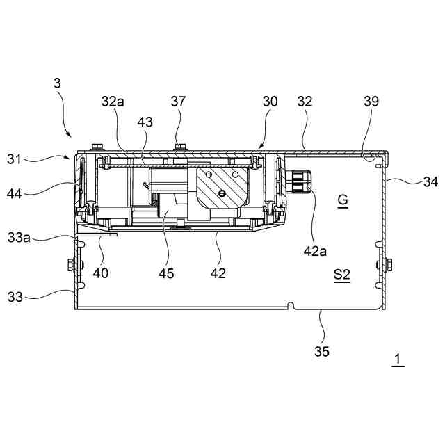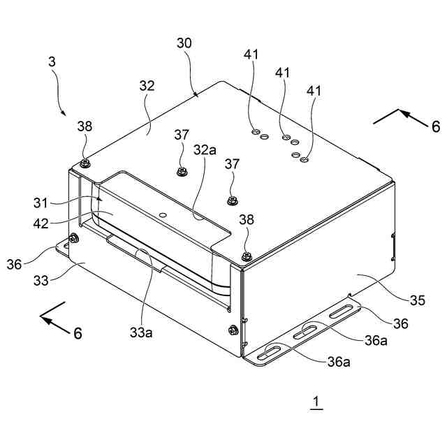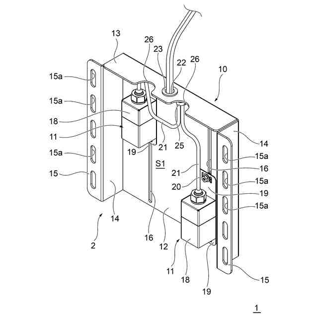 ブラケット10は、平板状の前板12と、前板12の上辺から折れ曲がる上板13と、前板12の1対の側辺から折れ曲がる1対の側板14、14と、を有している。この例では、前板12、上板13及び1対の側板14、14によって概ね直方体の収容空間S1が形成される。前板12の下辺には下板は形成されない。また、ブラケット10は、前板12に対応する後板を有していない。その結果、収容空間S1の下面及び背面は開放されている。この例では、上板13は前板12に概ね90度の角度で交差する。同様に、1対の側板14、14は前板12及び上板13に概ね90度の角度で交差する。