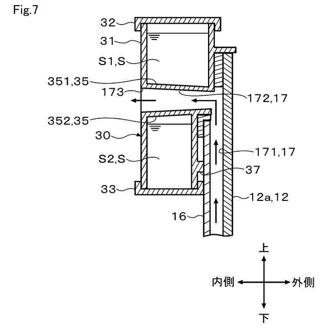 前記回転槽の径方向において、前記上側空間の寸法は、前記下側空間の寸法よりも外側方向に大きく設定されている、