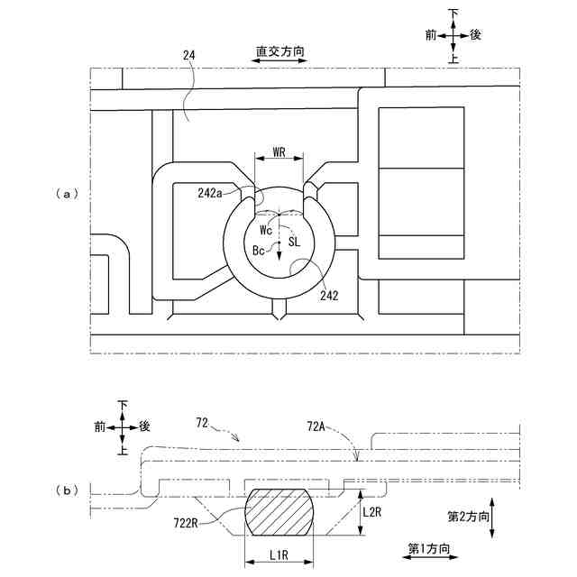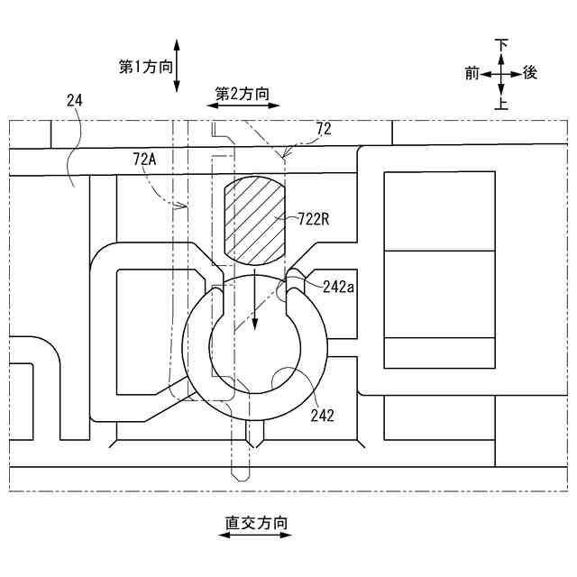 前記回動軸は、前記回動軸の軸方向と直交する第1方向において第1長さを有し、前記軸方向および前記第1方向と直交する第2方向において前記第1長さよりも小さい第2長さを有し、