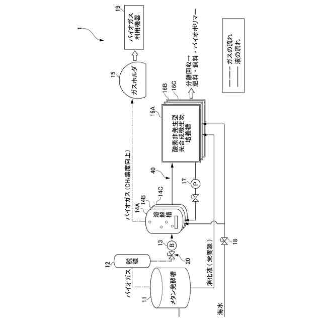 を回収固定する方法が記載されている。特許文献4には、有機性廃棄物をメタン発酵させてバイオガスを生成するメタン発酵槽と、メタン発酵槽で生成されたバイオガスを貯留するガス貯留手段と、光合成微生物を培養する培養槽を備えたメタン発酵装置が記載されている。