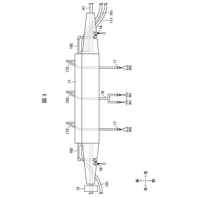 前記複数のノズルは、前記洗浄ユニットの車幅方向端部に位置し、噴射しつつ、左右スイング可能な第1ノズルと、前記洗浄ユニットの車幅方向中央に位置し、噴射しつつ、左右スイング可能な第2ノズルとを有し、
