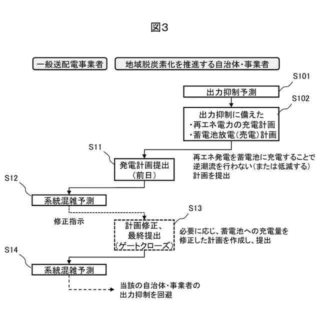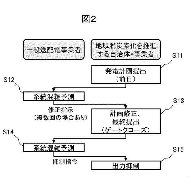 但し、最終計画において、系統混雑の発生が予測される場合は、再エネ発電設備に対して出力抑制が指示される(ステップS15)。例えば、再エネ発電設備のパワーコンディショナーに対するオンライン制御が行われる。このことで、再エネ発電設備での発電が抑制される。抑制された発電分に対しては補償がなされないため、出力抑制は発電事業者にとって機会損失となる。出力抑制スケジュールは出力抑制直前に送付されるため、地域脱炭素化を推進する自治体・事業者は出力抑制回避の対策を行うことが出来ない。したがって、DERMSとDMSの情報連携が無い状況下では、地域脱炭素化を推進する自治体・事業者は、出力抑制による機会損失を回避することが困難である。
