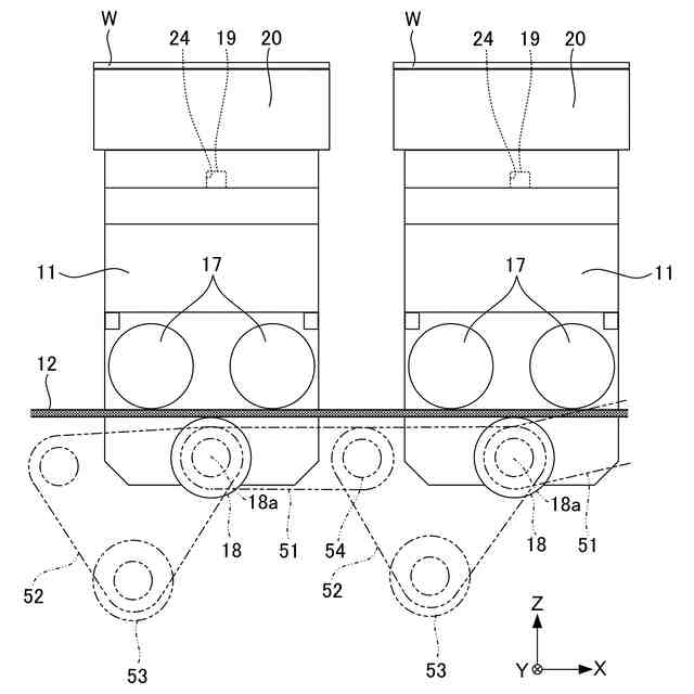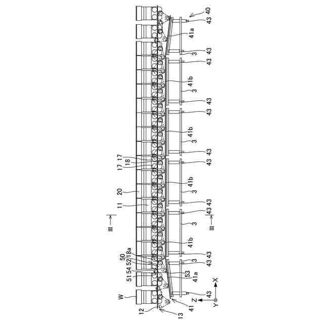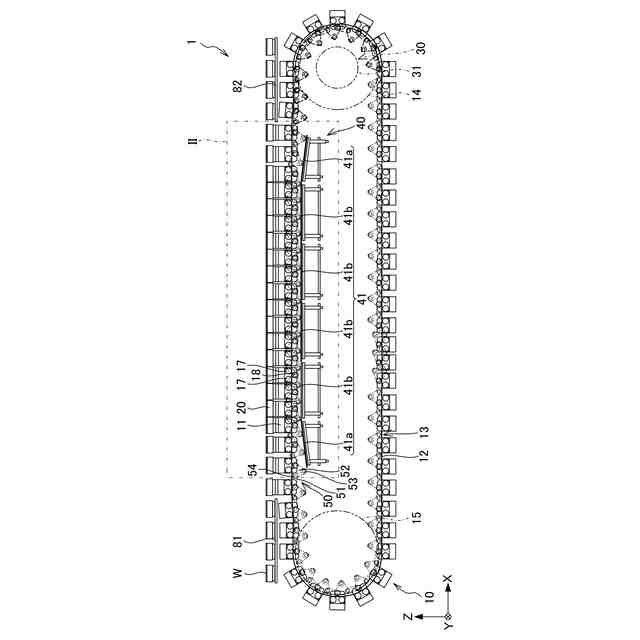 前記搬送方向に沿って複数設けられて前記ワークを支持する支持部材と、前記支持部材の軌道を設定する軌道レールと、を有し、前記搬送方向に沿って前記支持部材を搬送する搬送機構と、