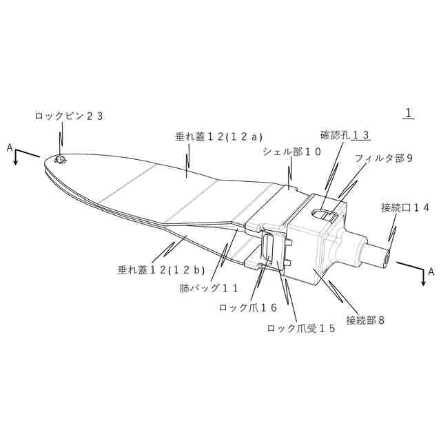 さらに、上記(1)の構成によれば、それぞれ耐久性が異なる、前記フィルタ部を内包する前記接続部と、バネ弾性を有する二つの前記垂れ蓋と、当該垂れ蓋を着脱可能に備えるシェル部と、および前記肺バッグと、が着脱可能に接続されることにより、交換が容易となりユーザの費用負担を軽減することが可能である。